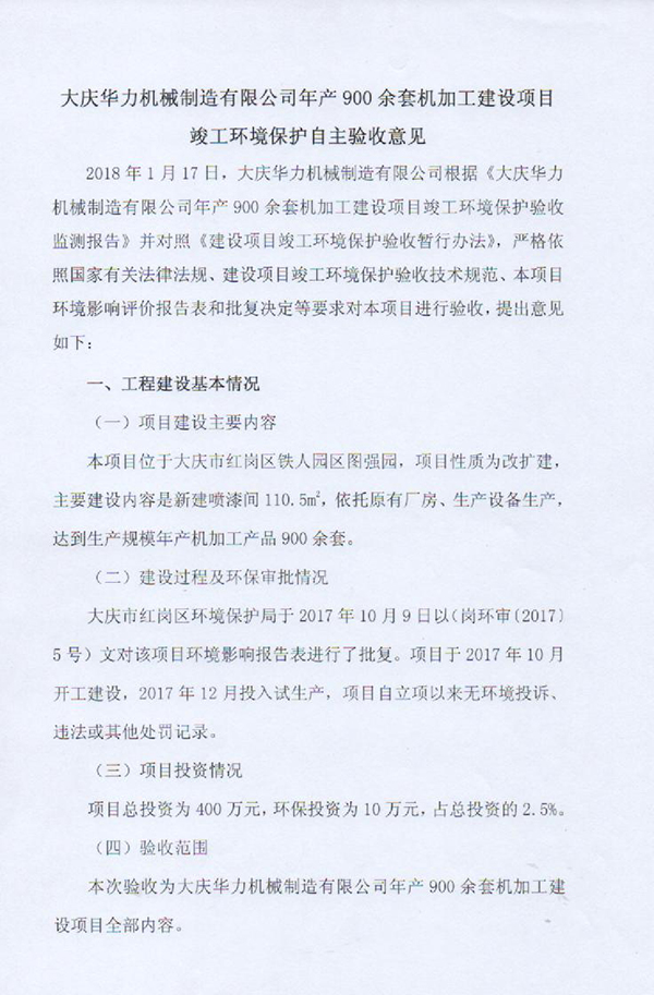 大慶華力機械制造有限公司年產(chǎn)900余套機加工建設(shè)項目自主驗收公示